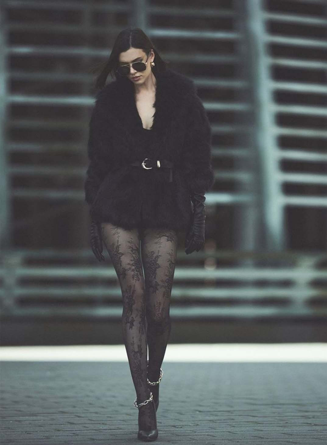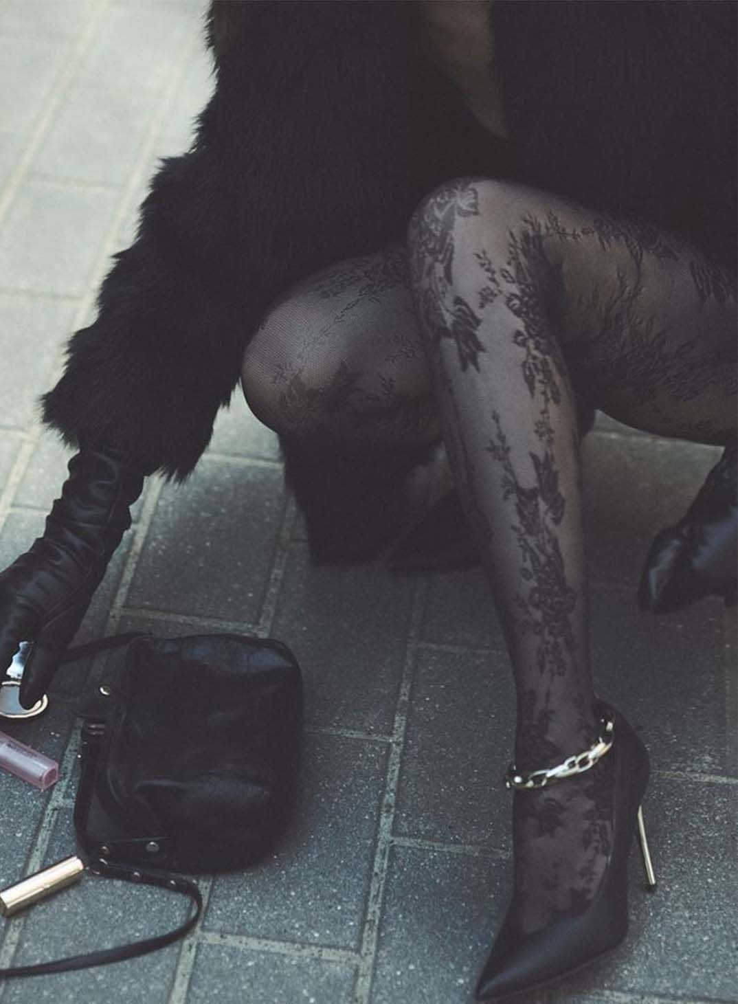 Superbe collant fantaisie noirs en micro résille avec des motifs floraux tout le long de la jambe. Notre Coup de Coeur !
