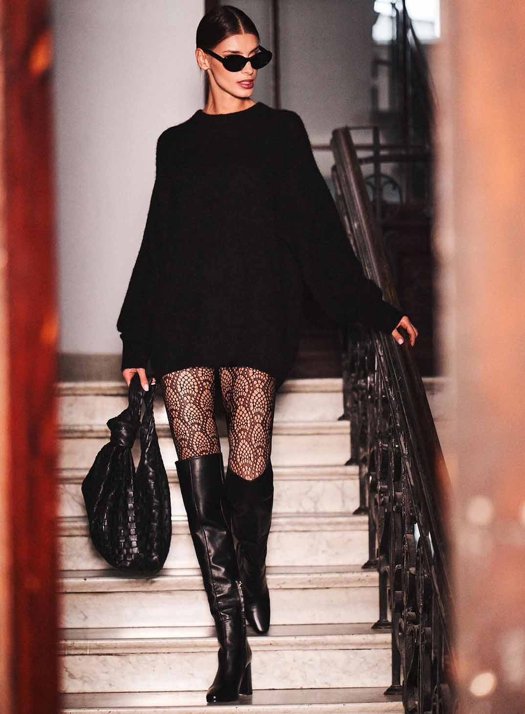 Superbe collant résille noir avec motifs tout le long de la jambe. Ce collant vous donnera un look moderne et sophistiqué à la fois.