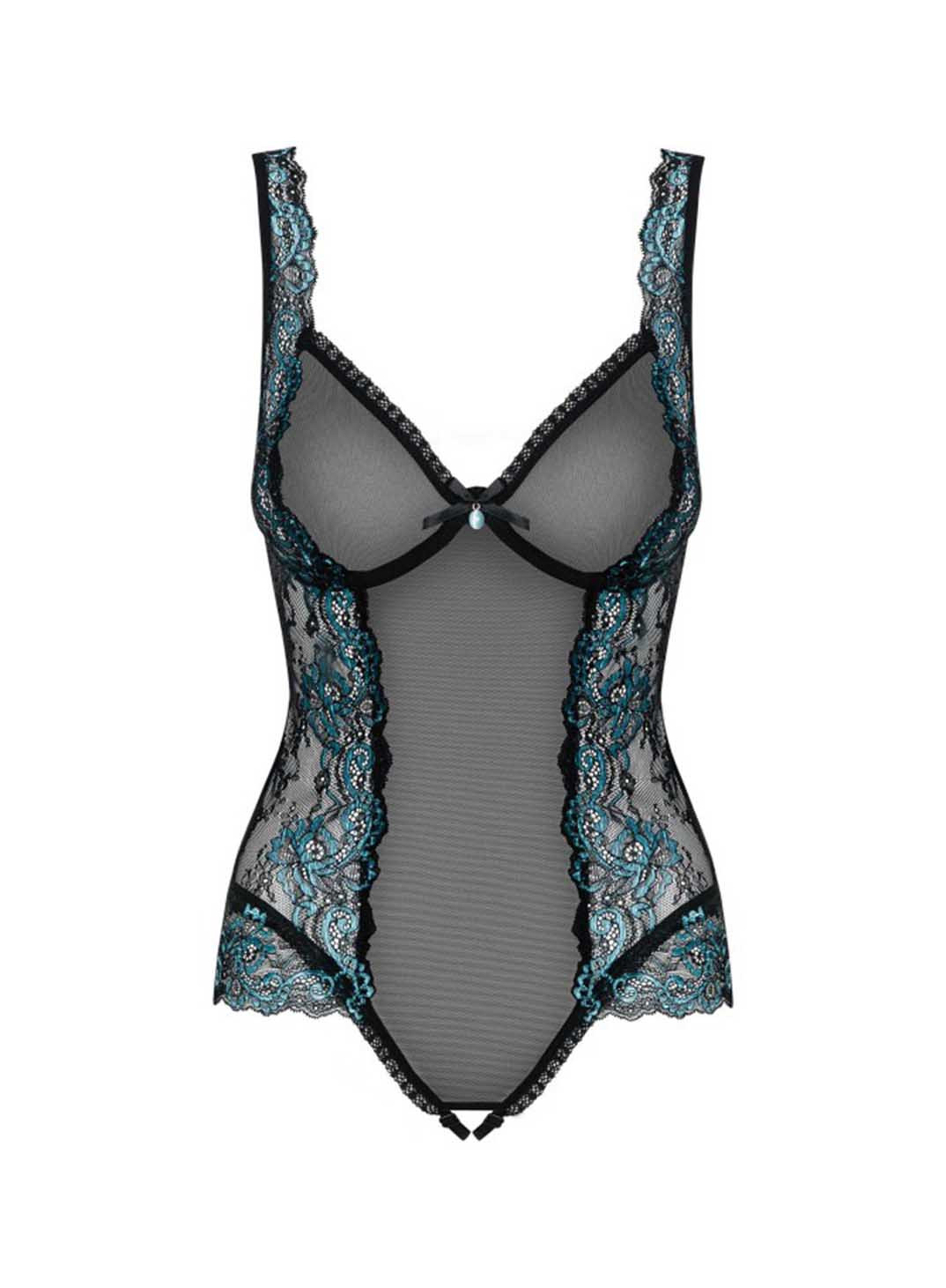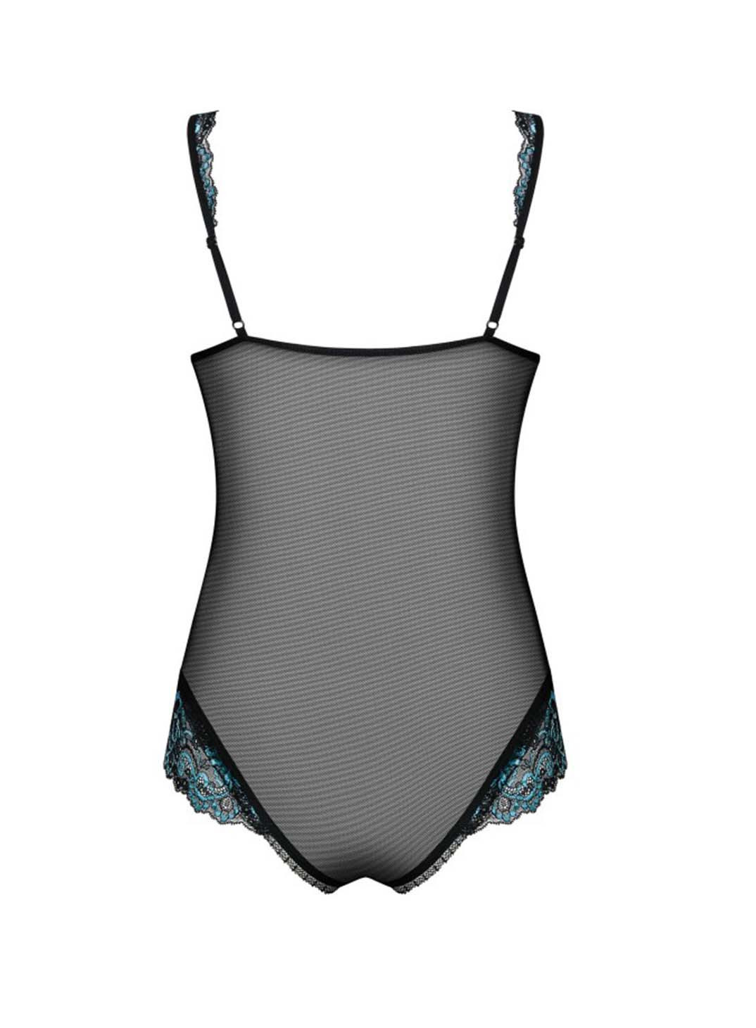 Succombez à l’élégance de ce body noir transparent sublimé par une dentelle turquoise raffinée. Sa coupe ajustée met en valeur les courbes tandis que les bretelles réglables et les bonnets à armatures assurent un maintien parfait.